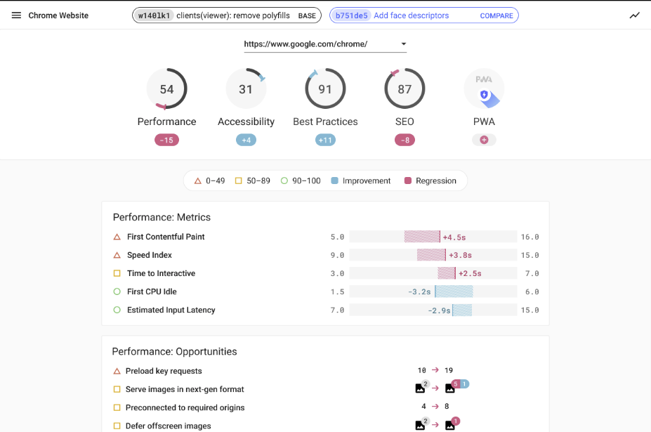 - View detailed diffs between any two Lighthouse reports finding the root cause of a regression